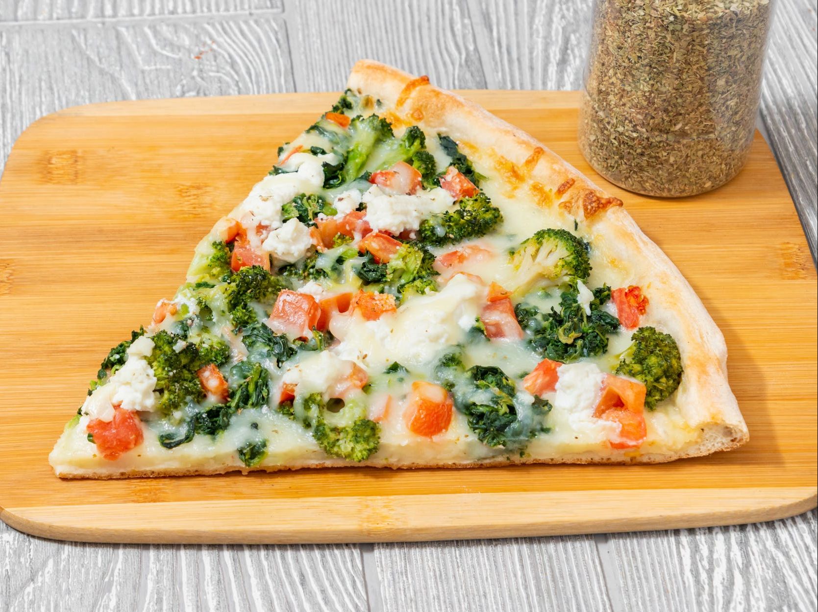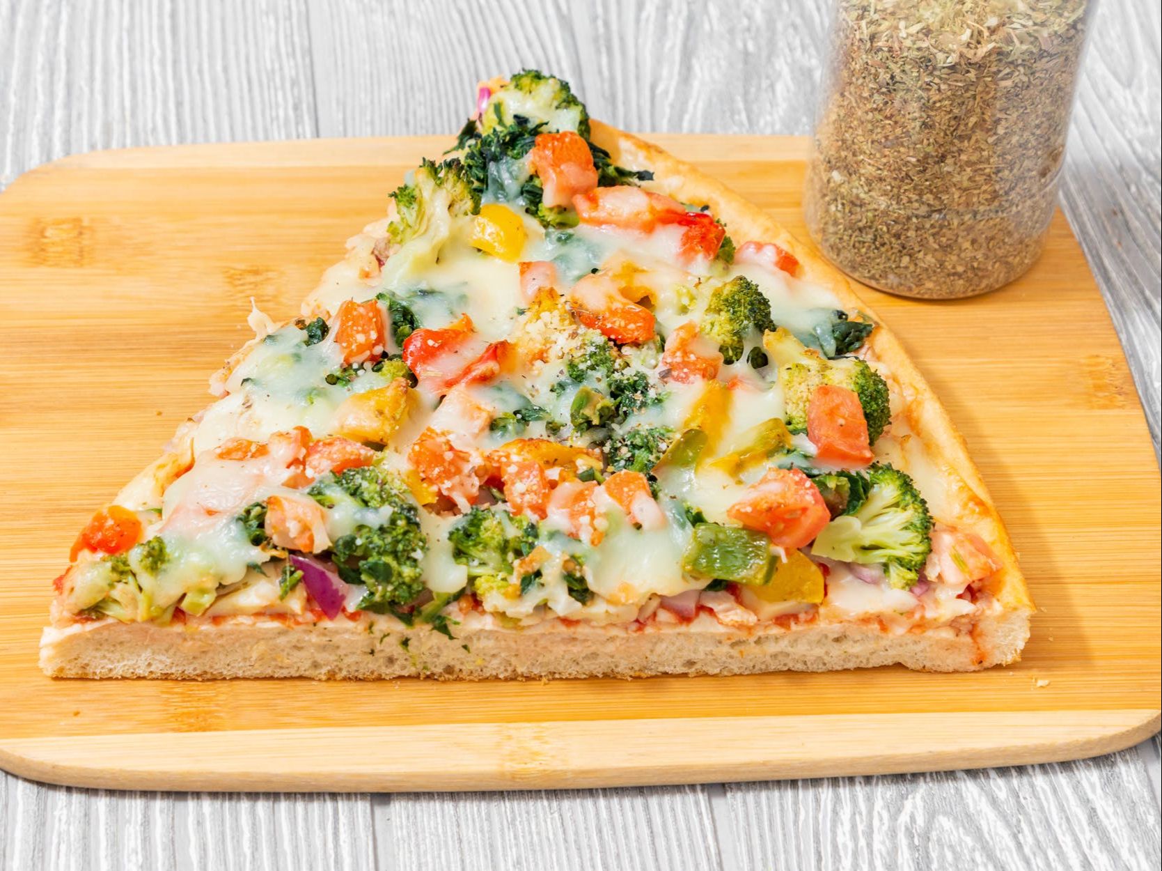 Broccoli, spinach, diced tomatoes, mushrooms, onions, bell peppers, tomato sauce & mozzarella cheese.